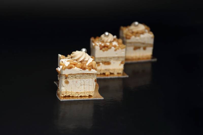 Tradition du Sud, la pyramide pignons de notre Maitre Pâtissier, nos pâtisseries vous proposent un biscuit sablé avec une crème au beurre praliné et pignons